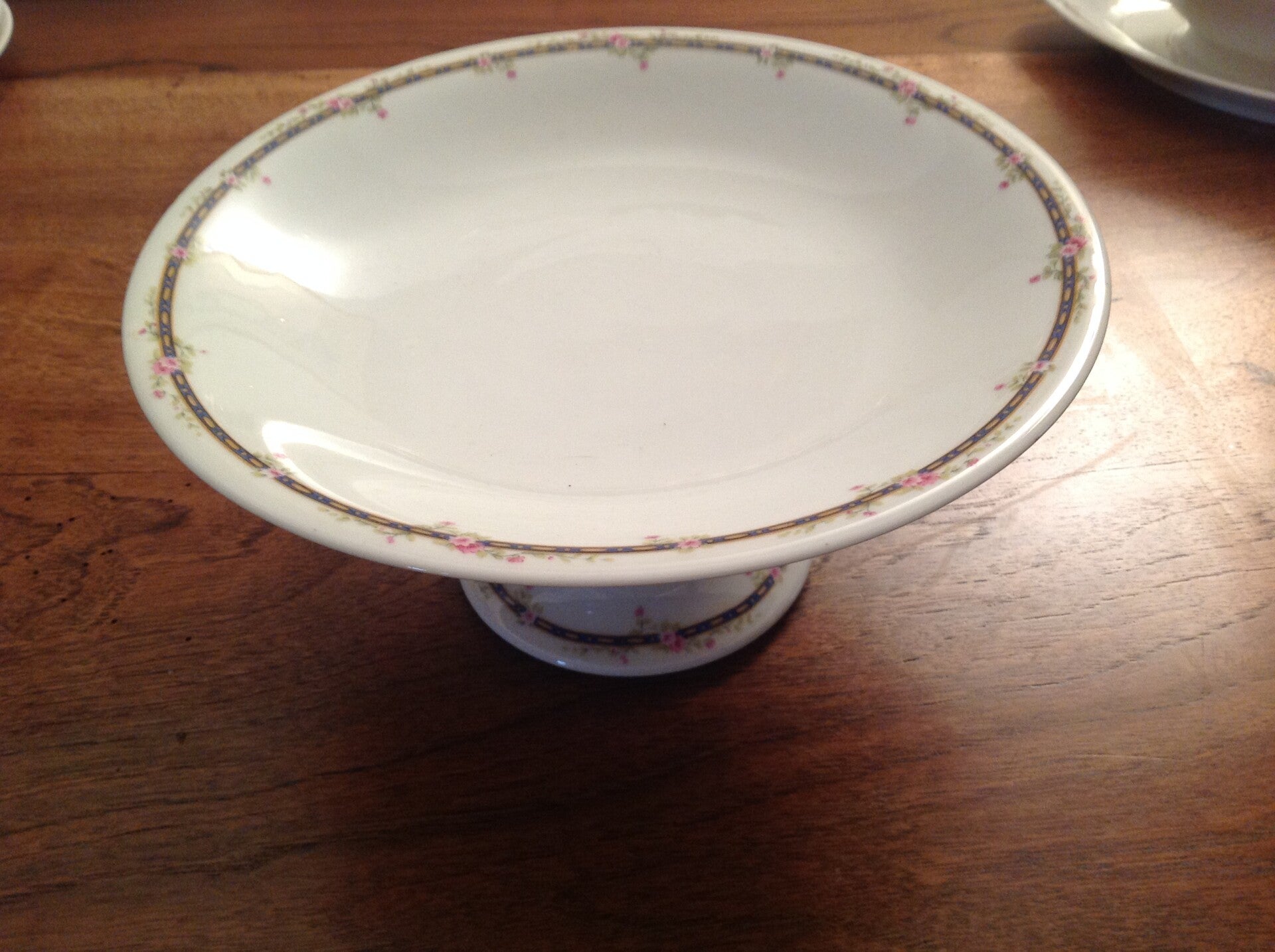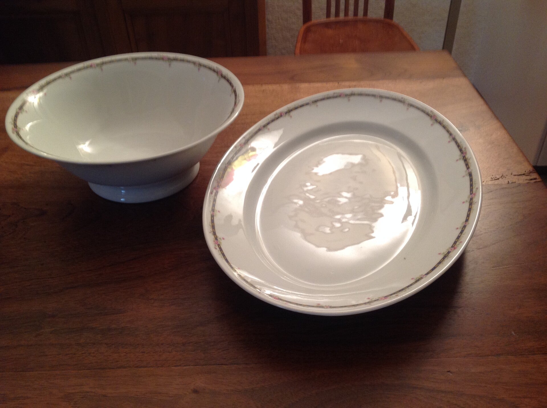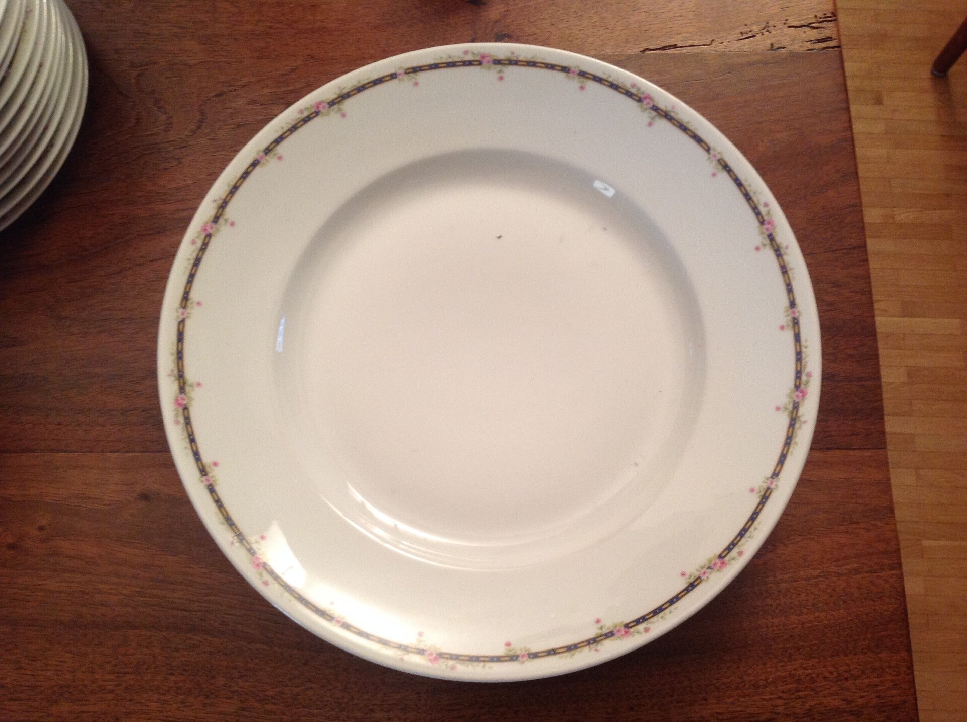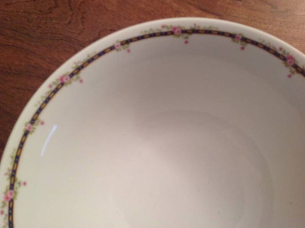 Pièces de porcelaine Limoges France WG & Cie comprenant 19 assiettes de 23.5 cm de diamètre, 9 assiettes à soupe 23.5 cm de diamètre, 10 assiettes à dessert de 20 cm de diamètre, 1 plat ovale 40 x 28 cm, 2 raviers 23 x 13 cm,1 plat rond 32 cm de diamètre, 1 centre de table de 23 cm, 1 saucière 25 x 15 cm, 1 saladier de 25.5 cm de diamètre, 1 légumier de 32 x 17 cm et 1 soupière de 38 x 23 cm