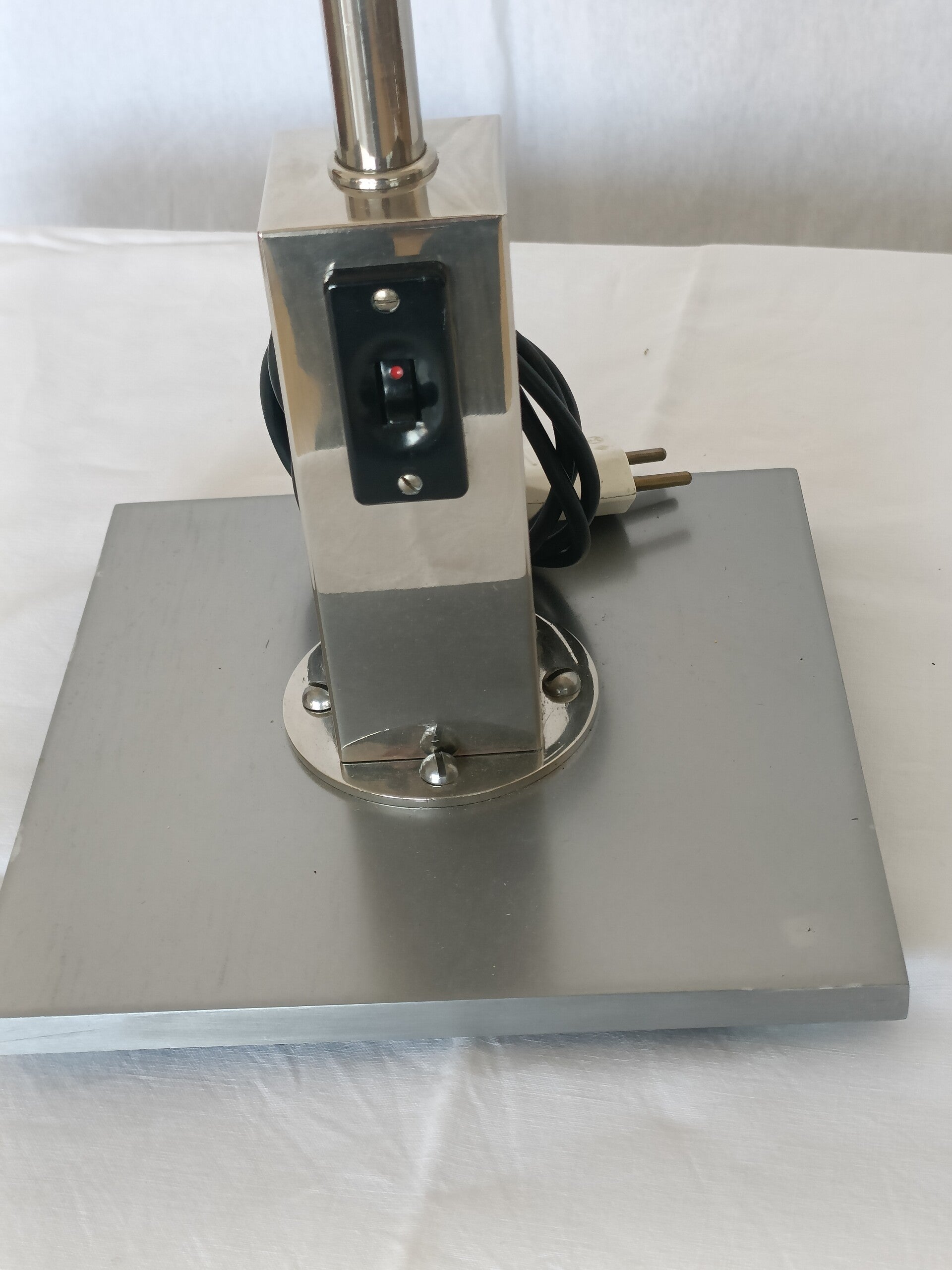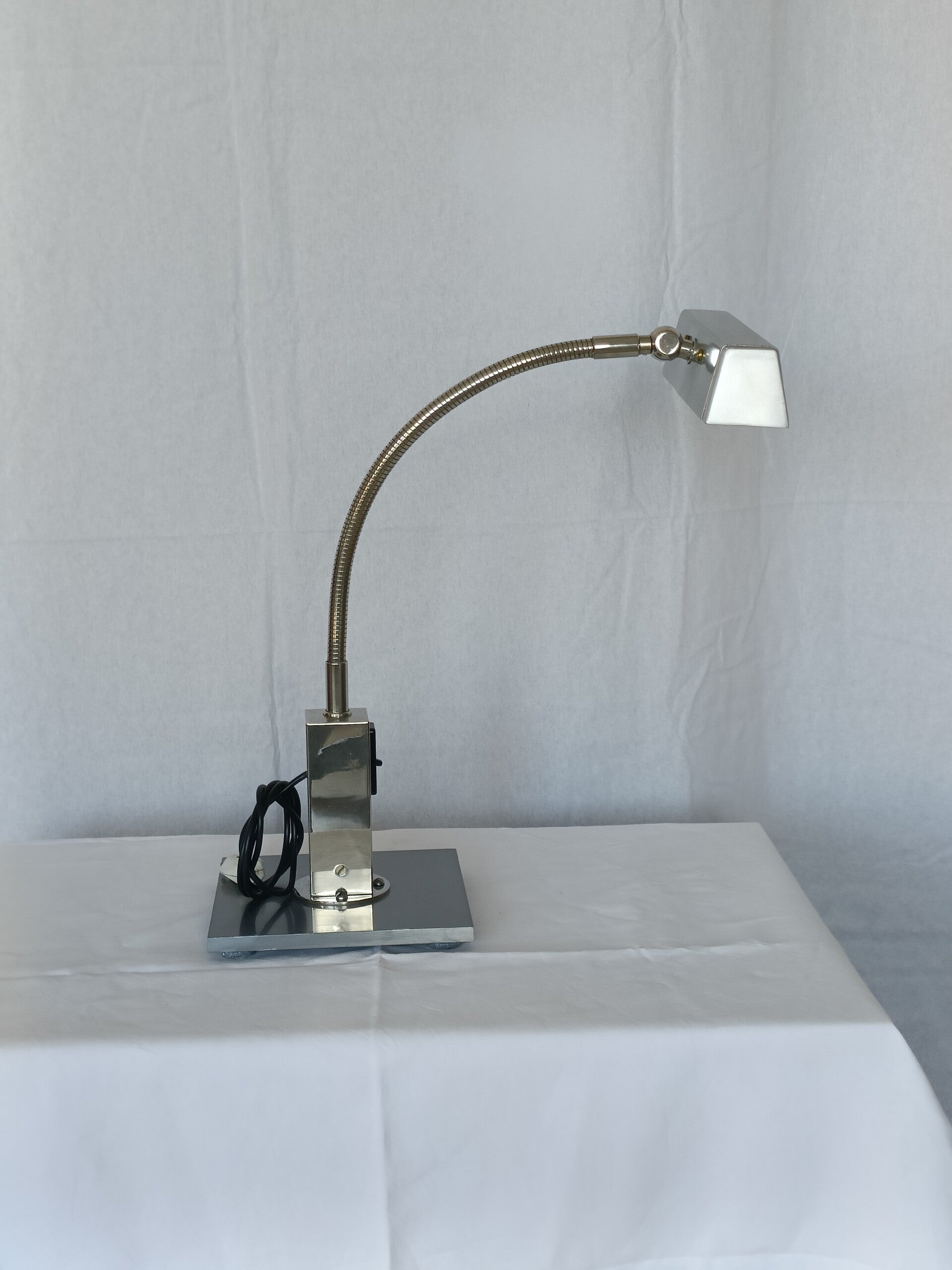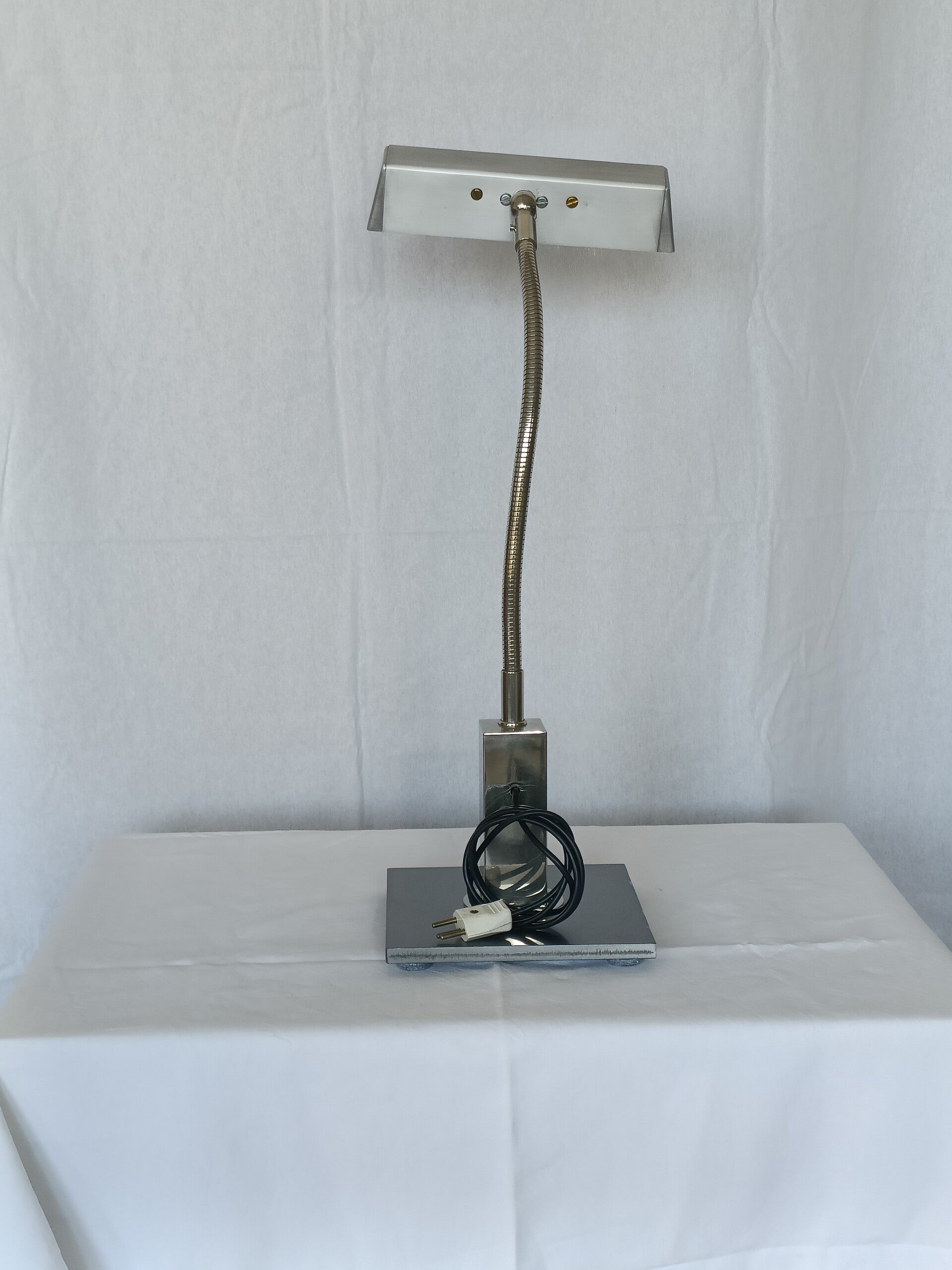 Lampe d'atelier en aluminium et acier, env. 1970, 2 petits néons, bras flexible. A été réélectrifiée et vérifiée. Inscription à l'intérieur du réflecteur "Alumag" Hauteur maximum 50 cm - Socle 20cm x 20 cm