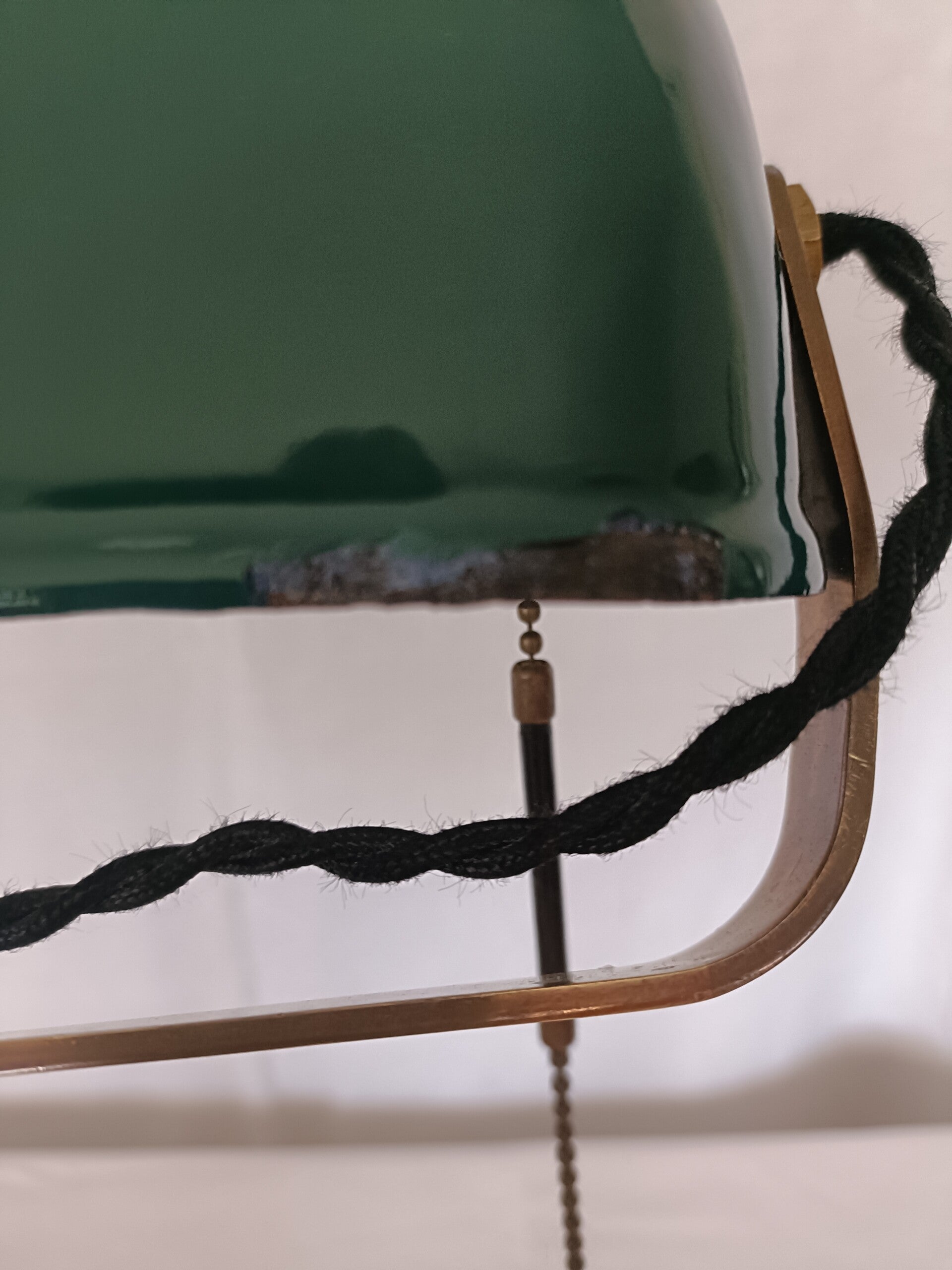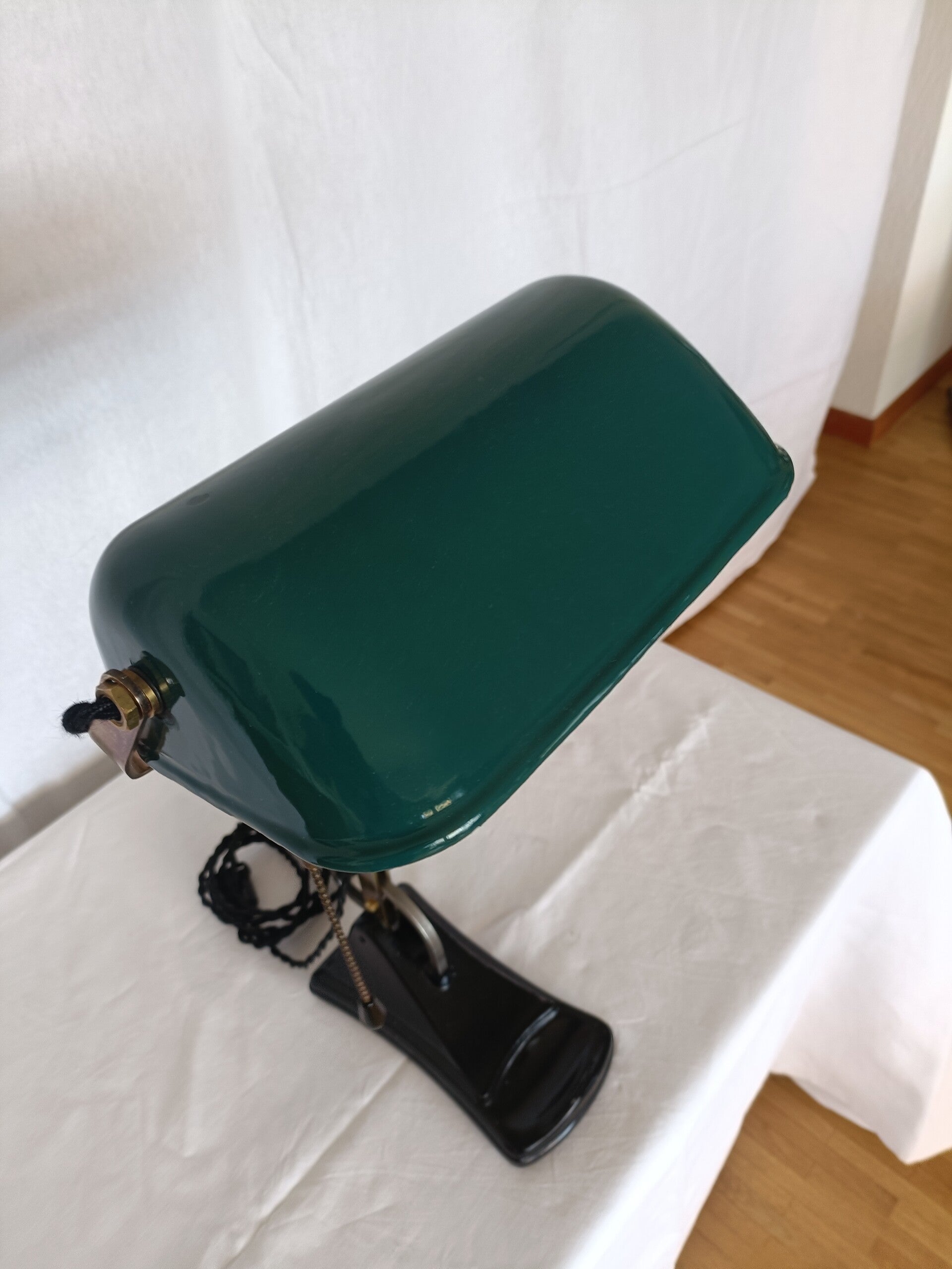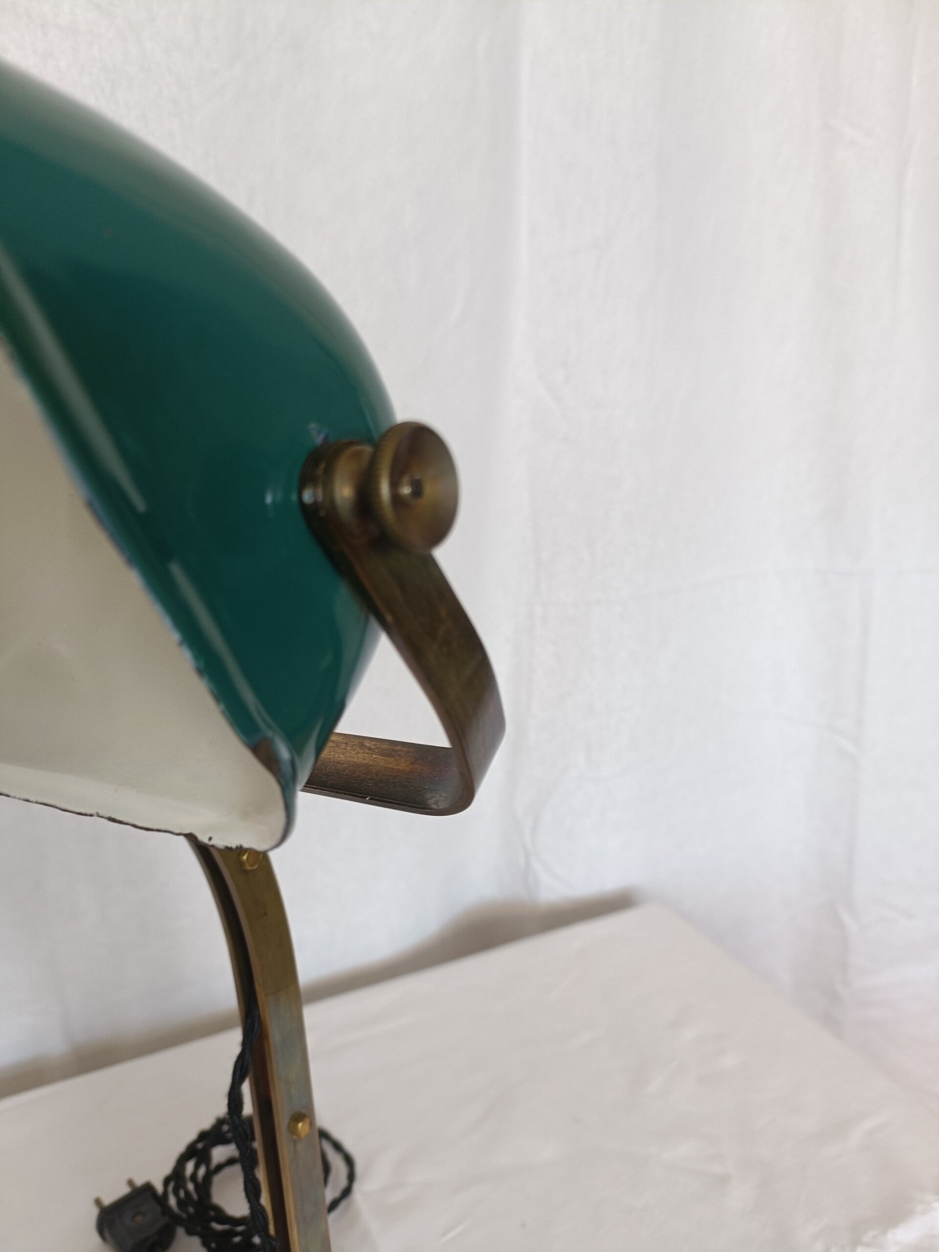 Lampe de bureau, vers 1930, socle en acier peint en noir, bras en laiton et réflecteur émaillé pivotant. A été revisée et réélectrifiée