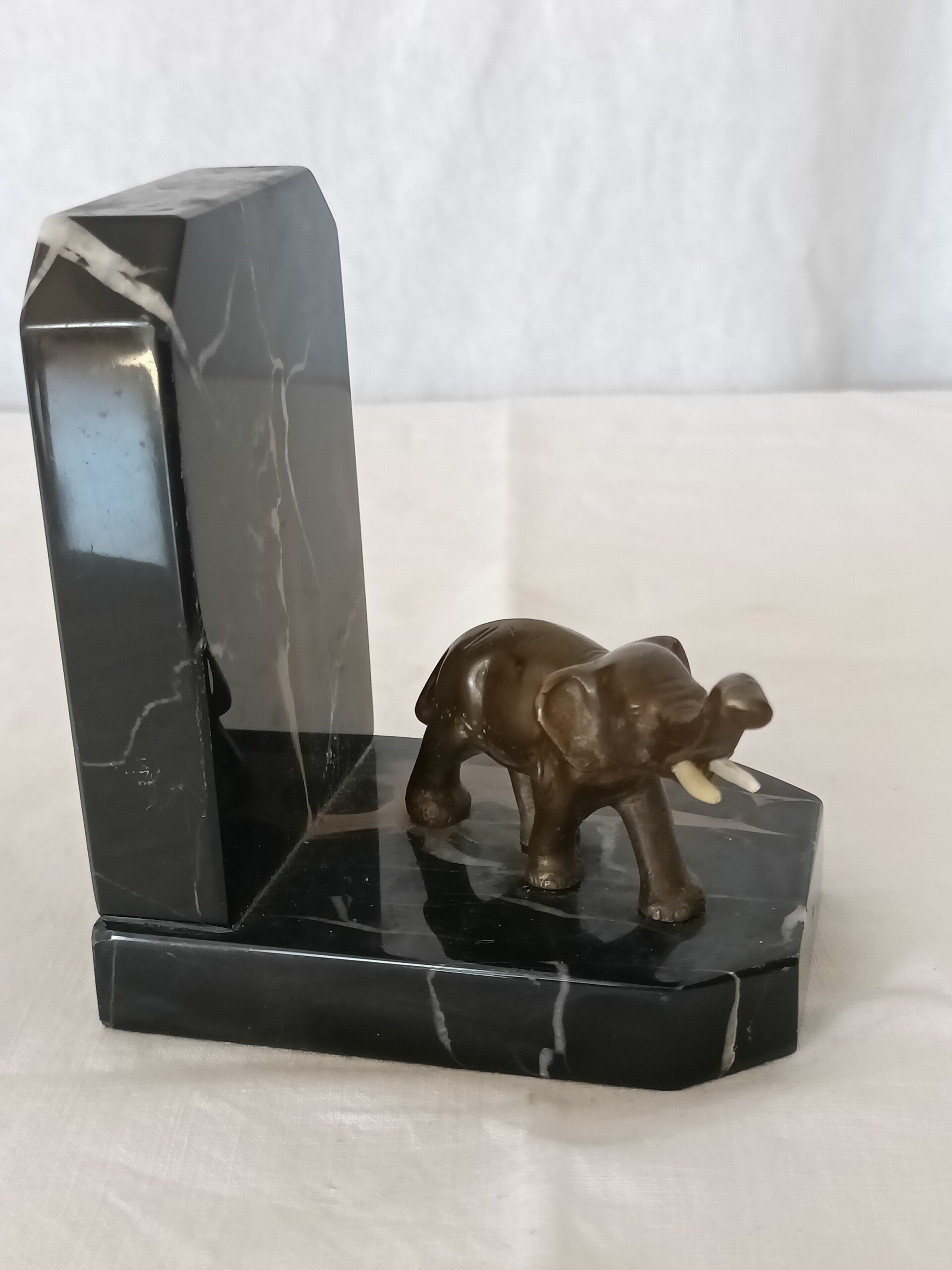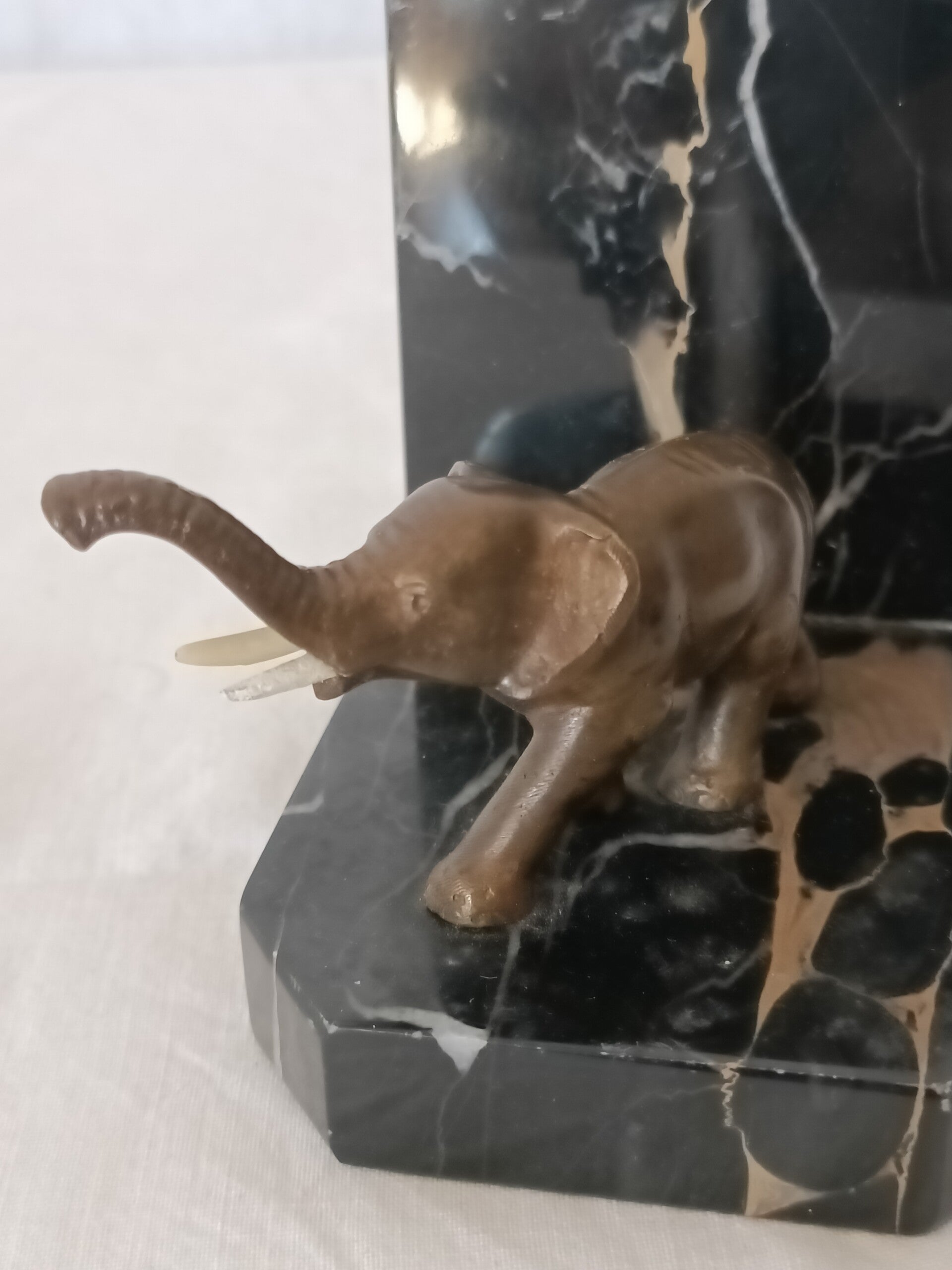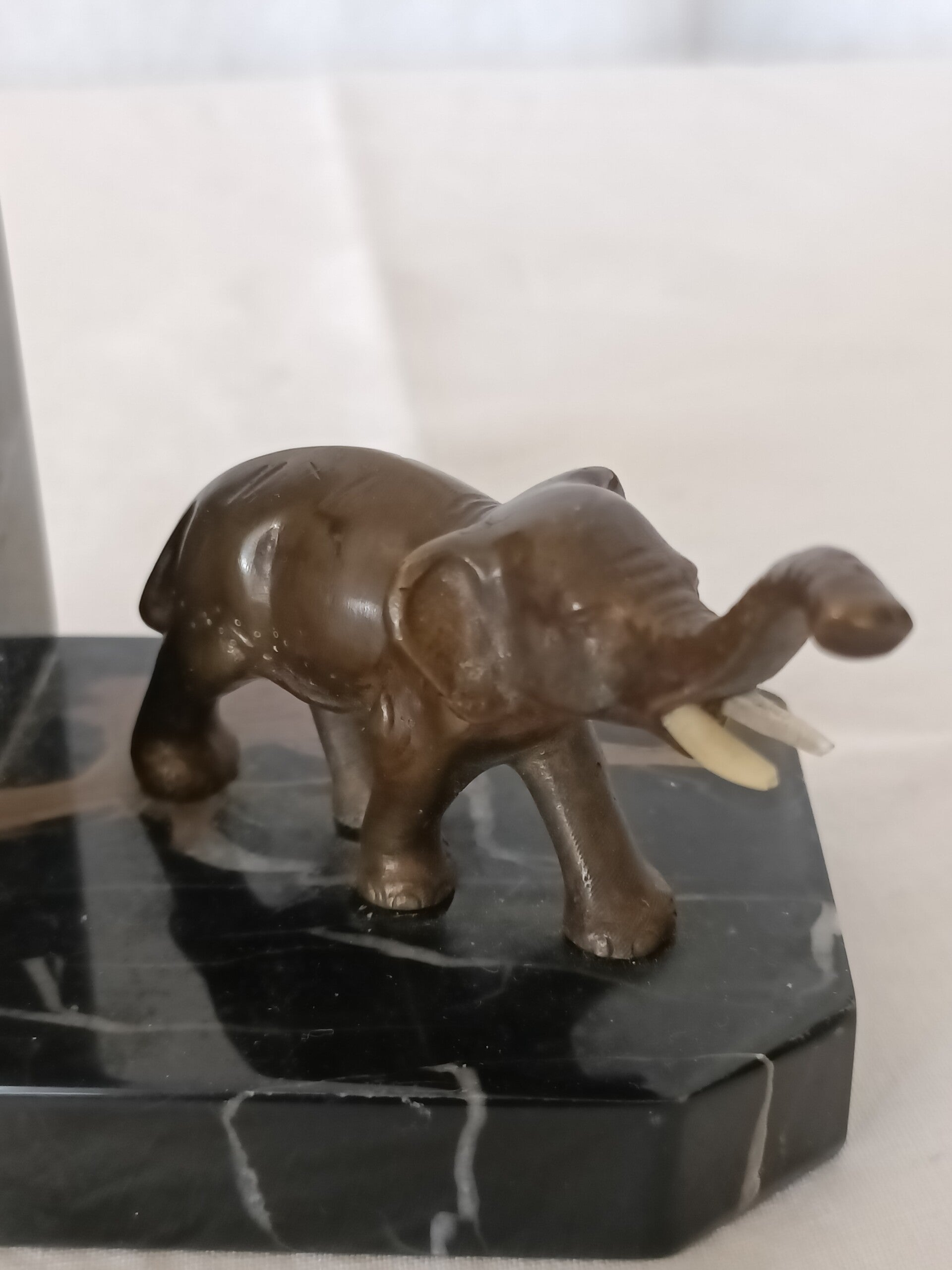Presse livres en marbre avec petit éléphant en bronze. Une défense n'est pas d'origine