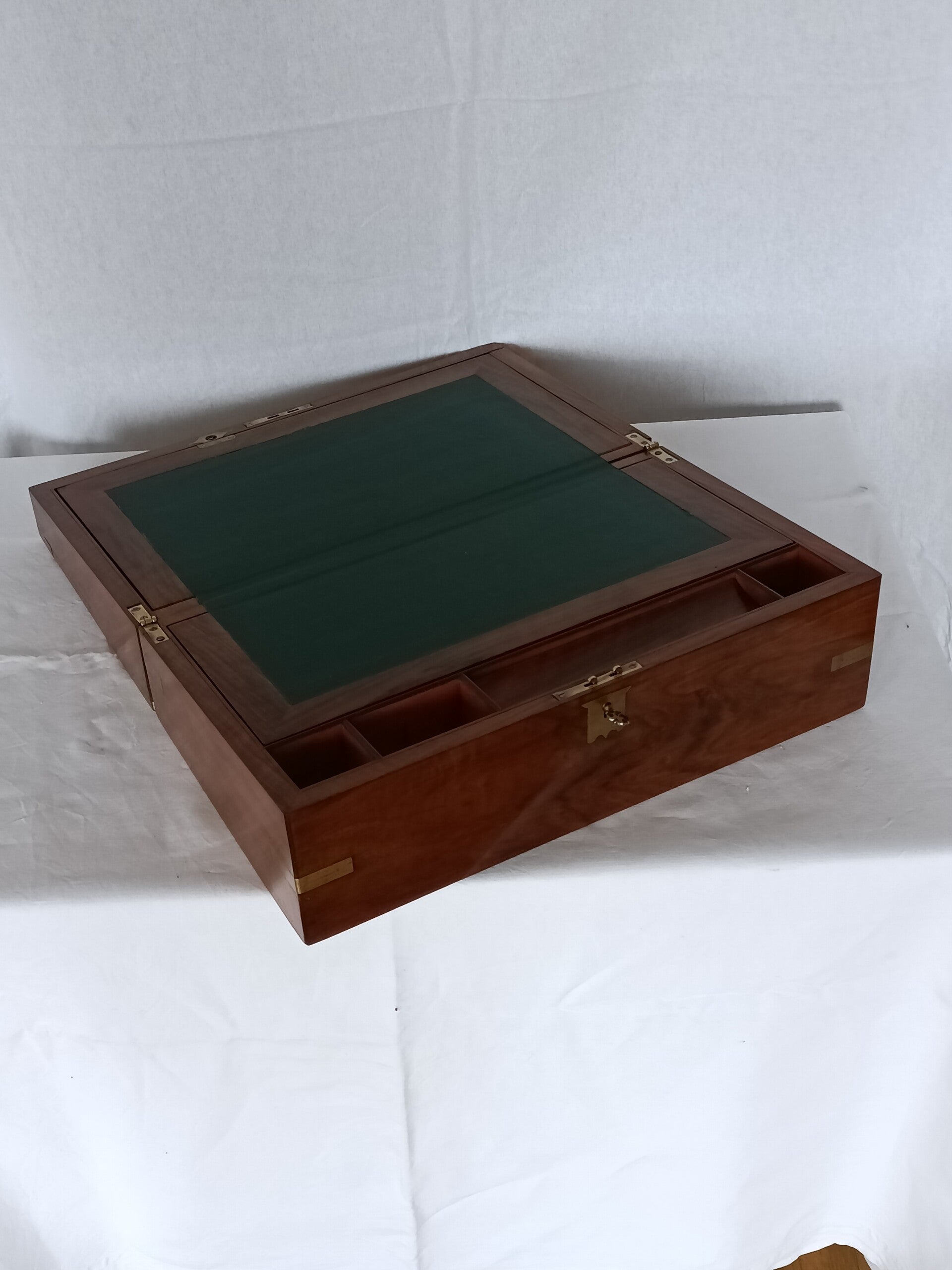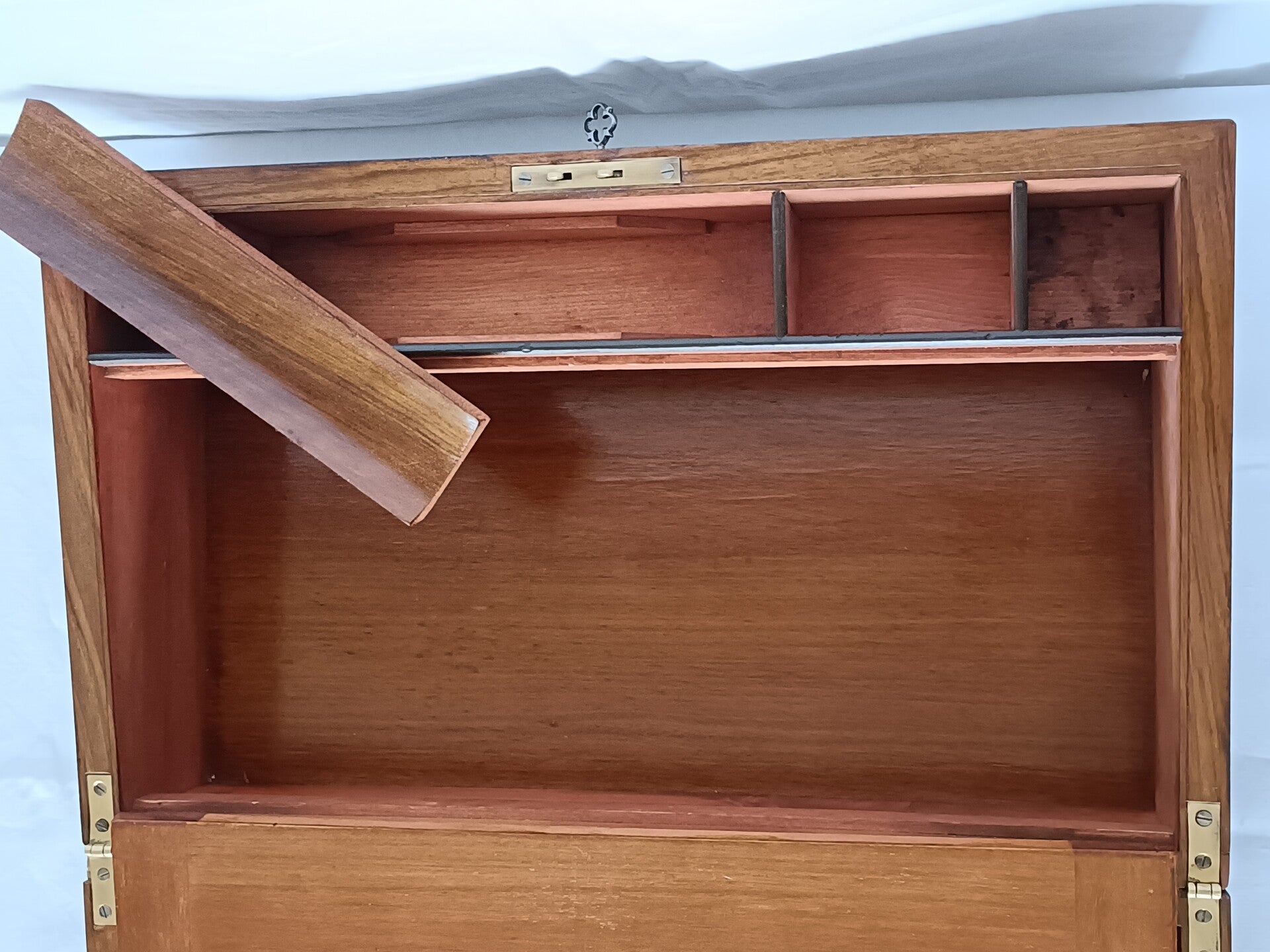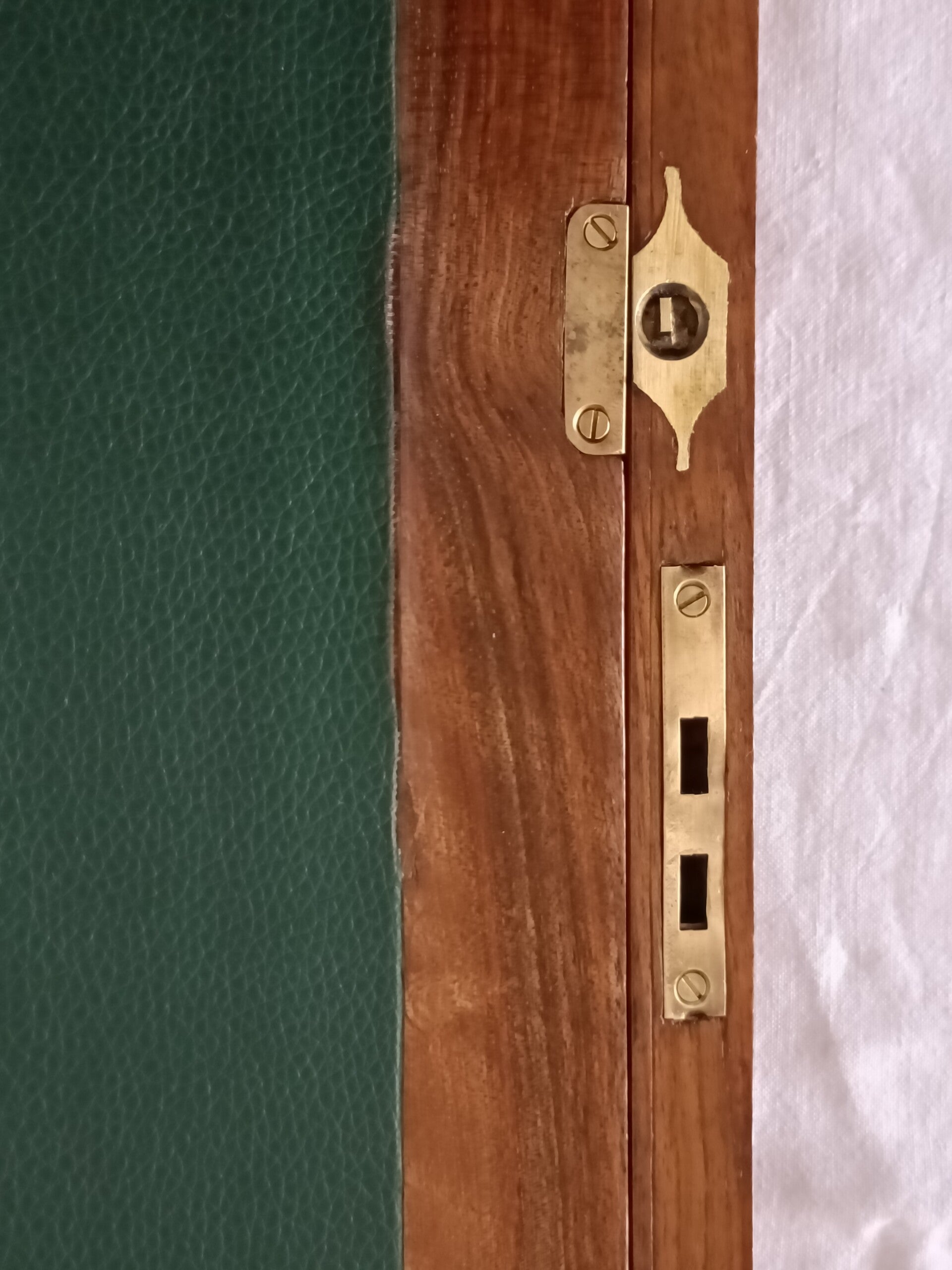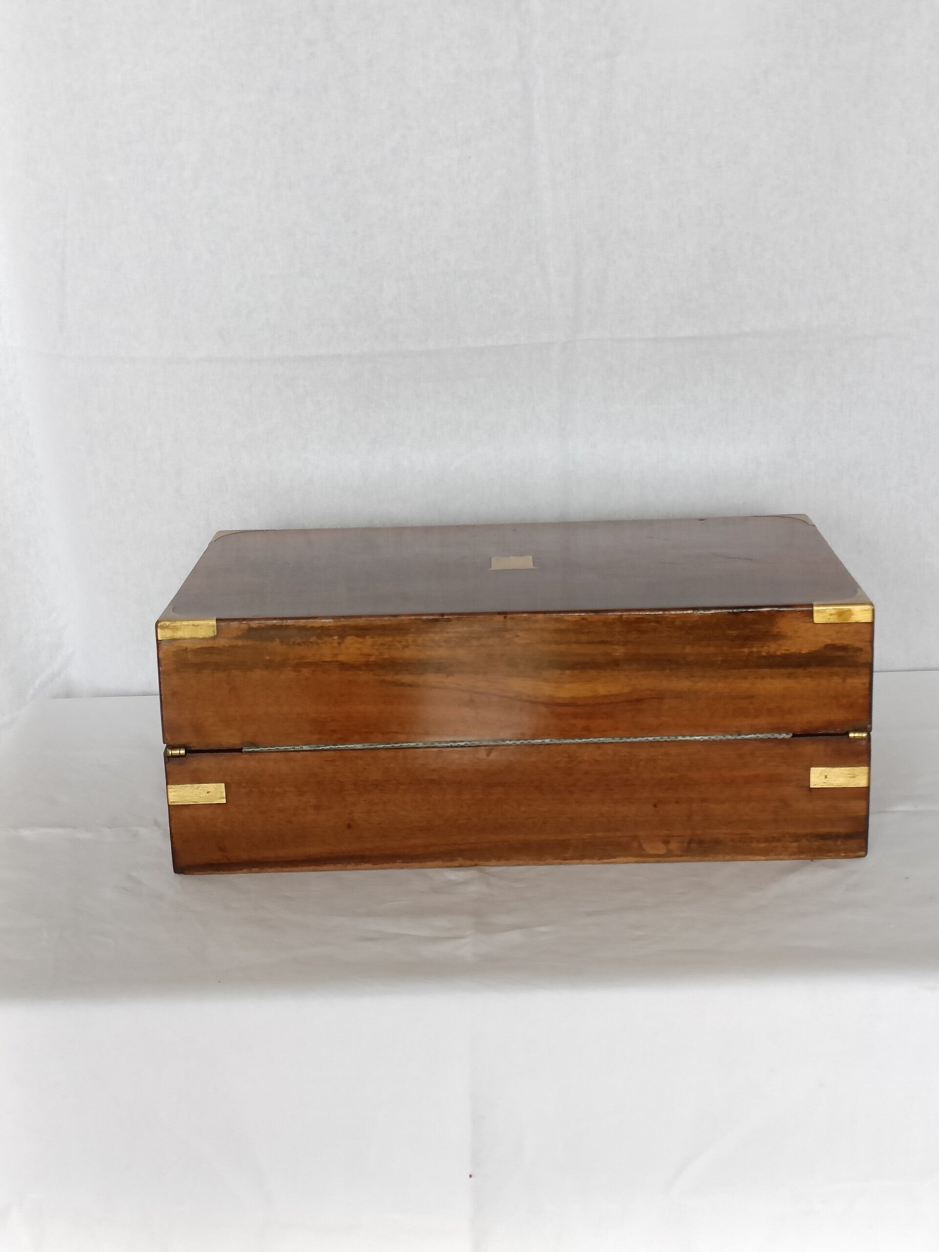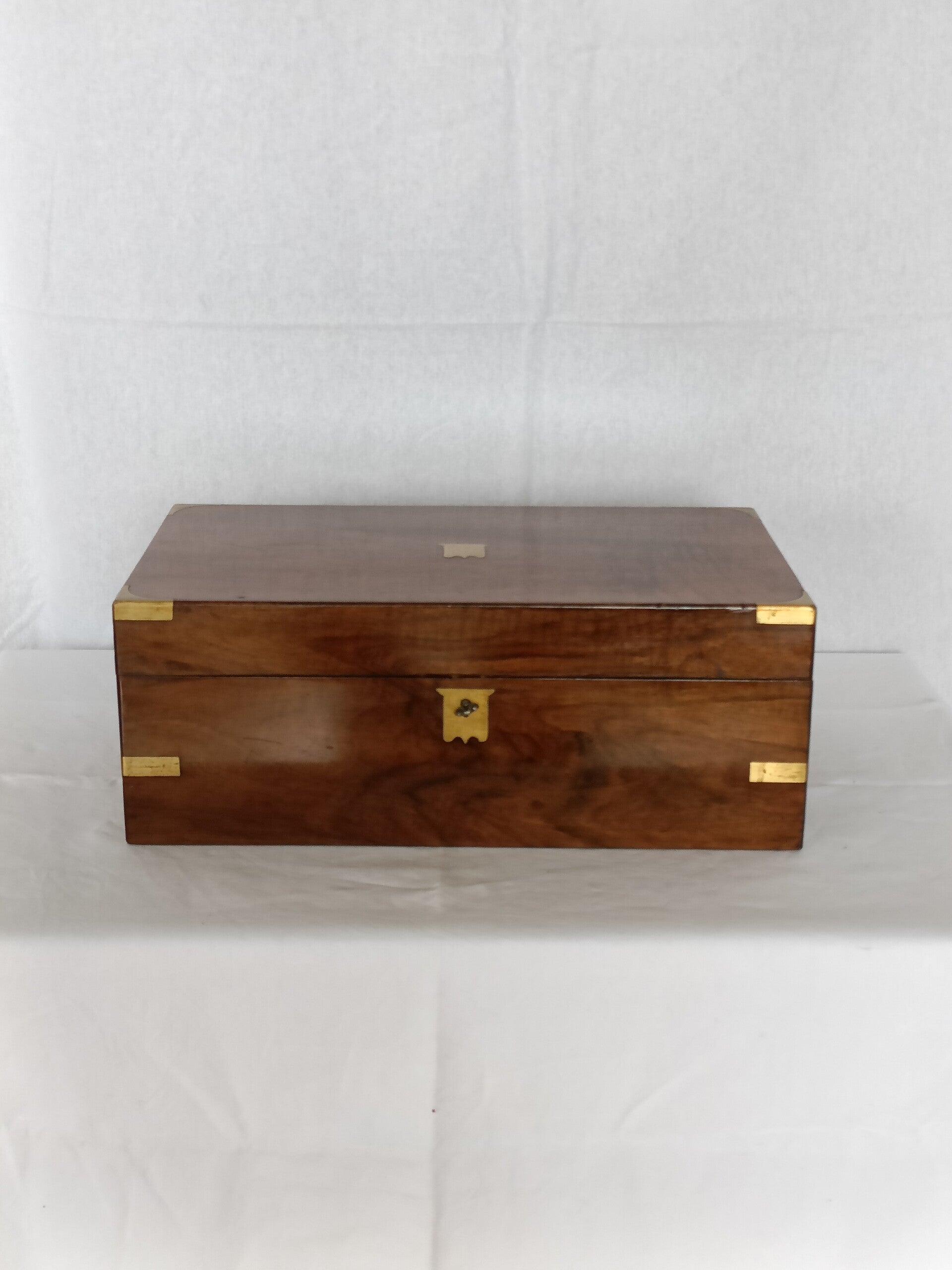 Ecritoire de voyage en noyer, angles en laiton et plaquette sur le dessus en laiton. A été restaurée. La clé fonctionne