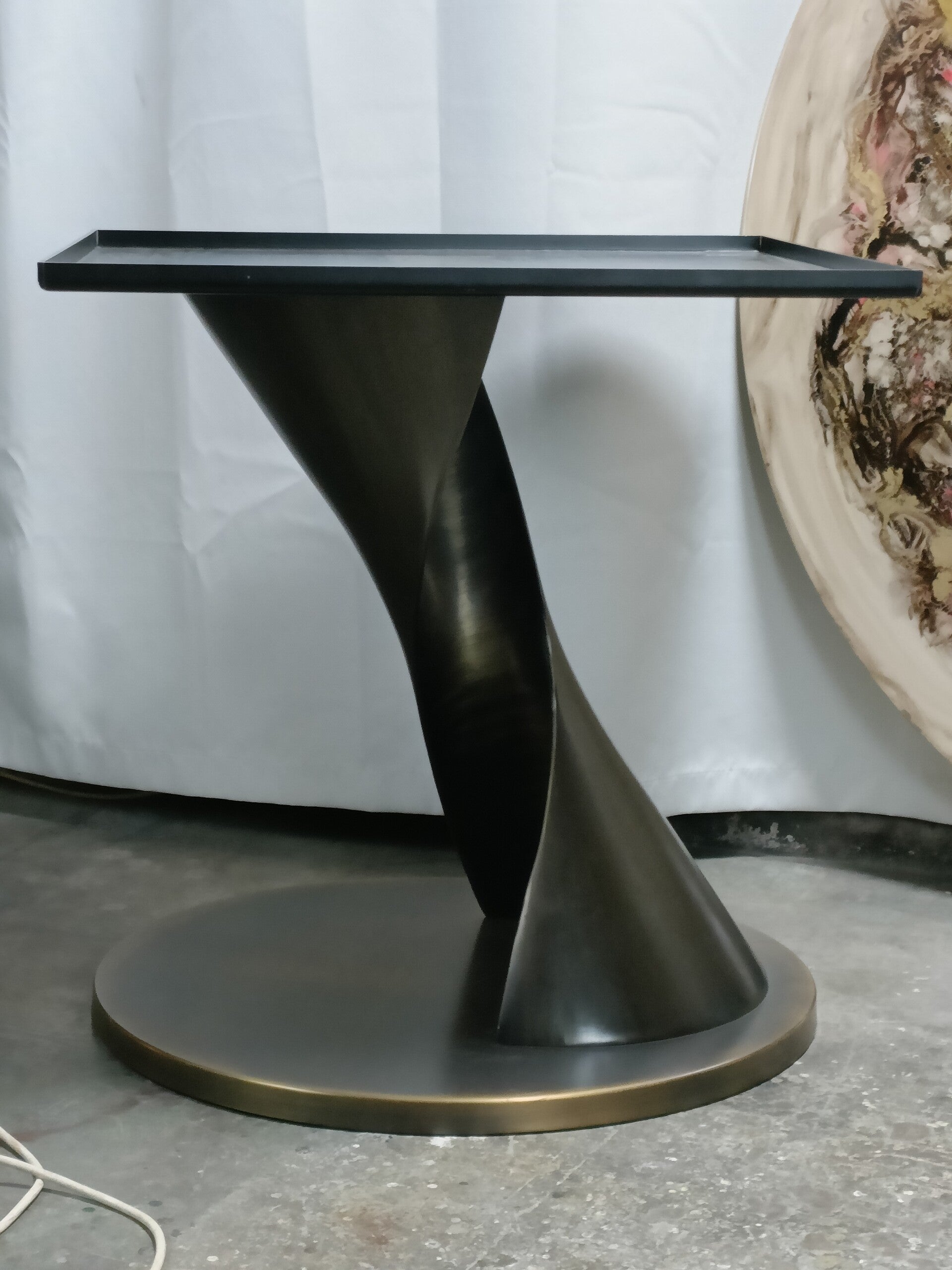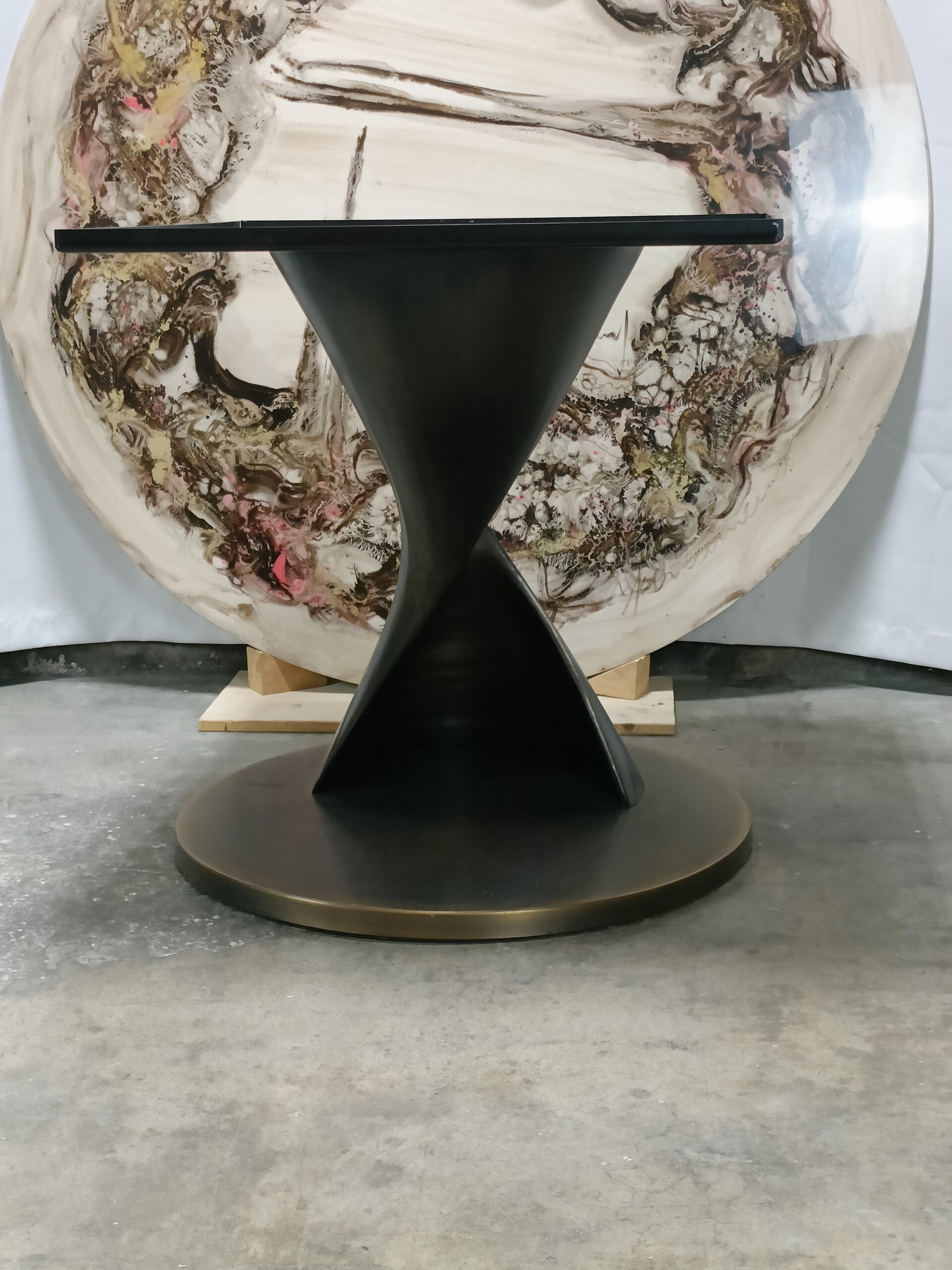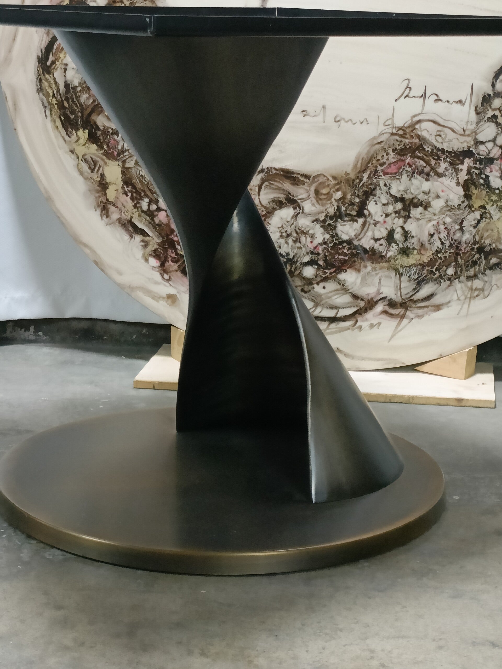 Table ronde de salle à manger italienne, pied métallique en spirale excentré, plateau en résine